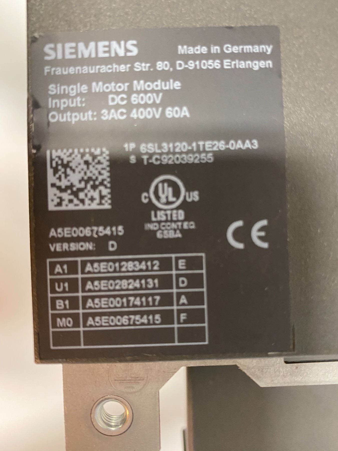 Siemens 1P 6SL3120-1TE26-0AA3 Single Motor Module