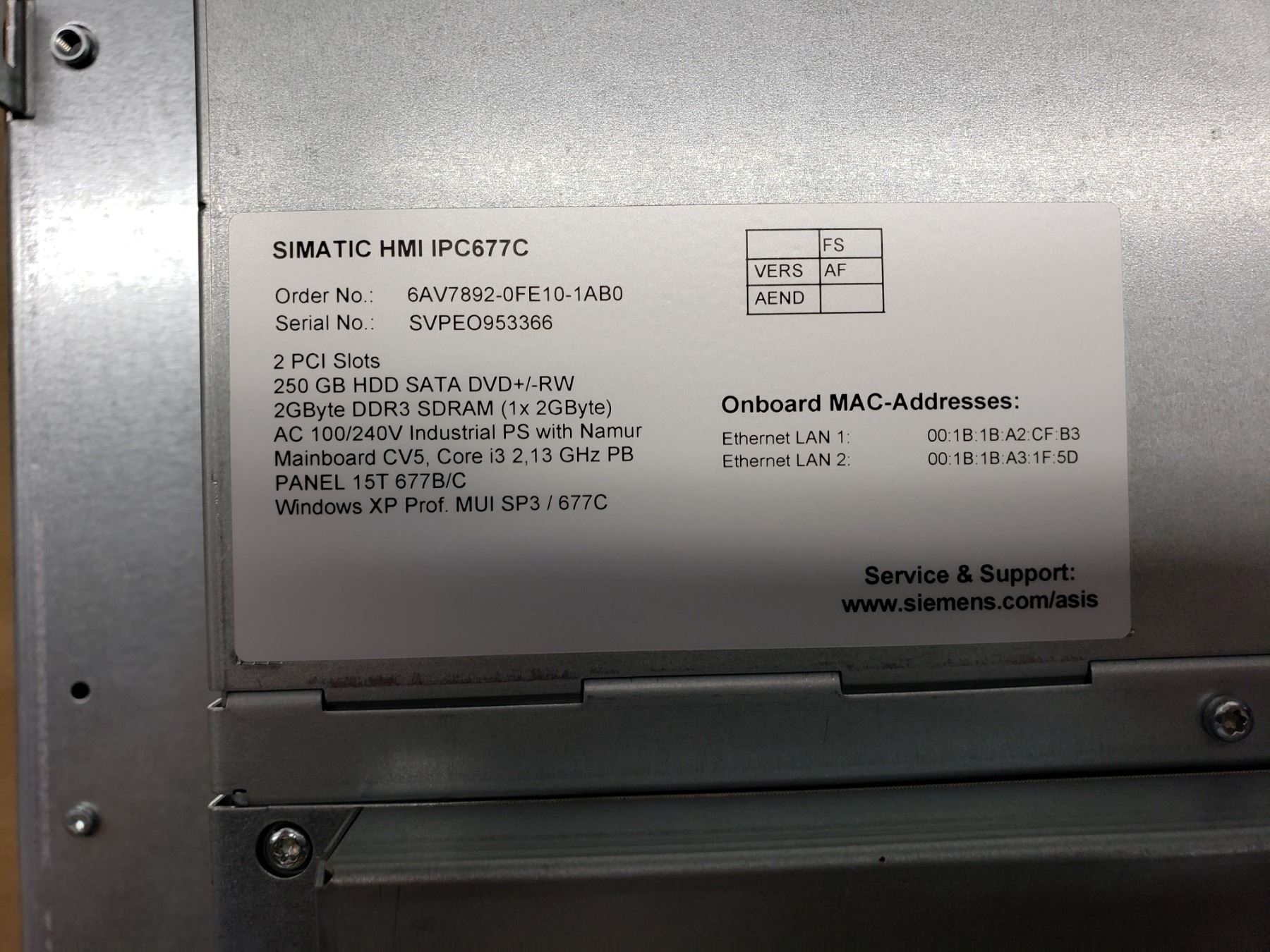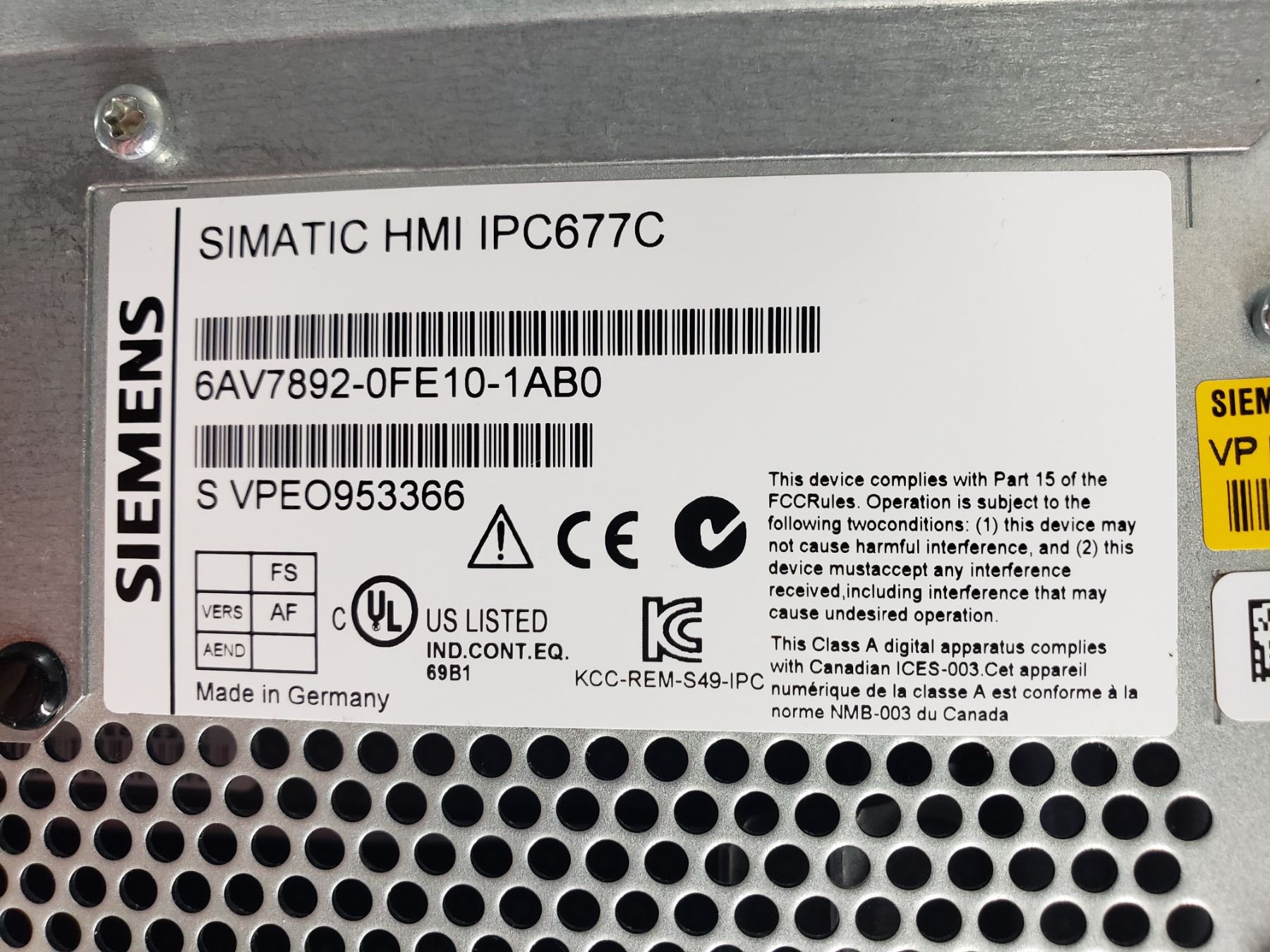 Siemens 6AV7892-0FE10-1AB0 SIMATIC HMI IPC677C
