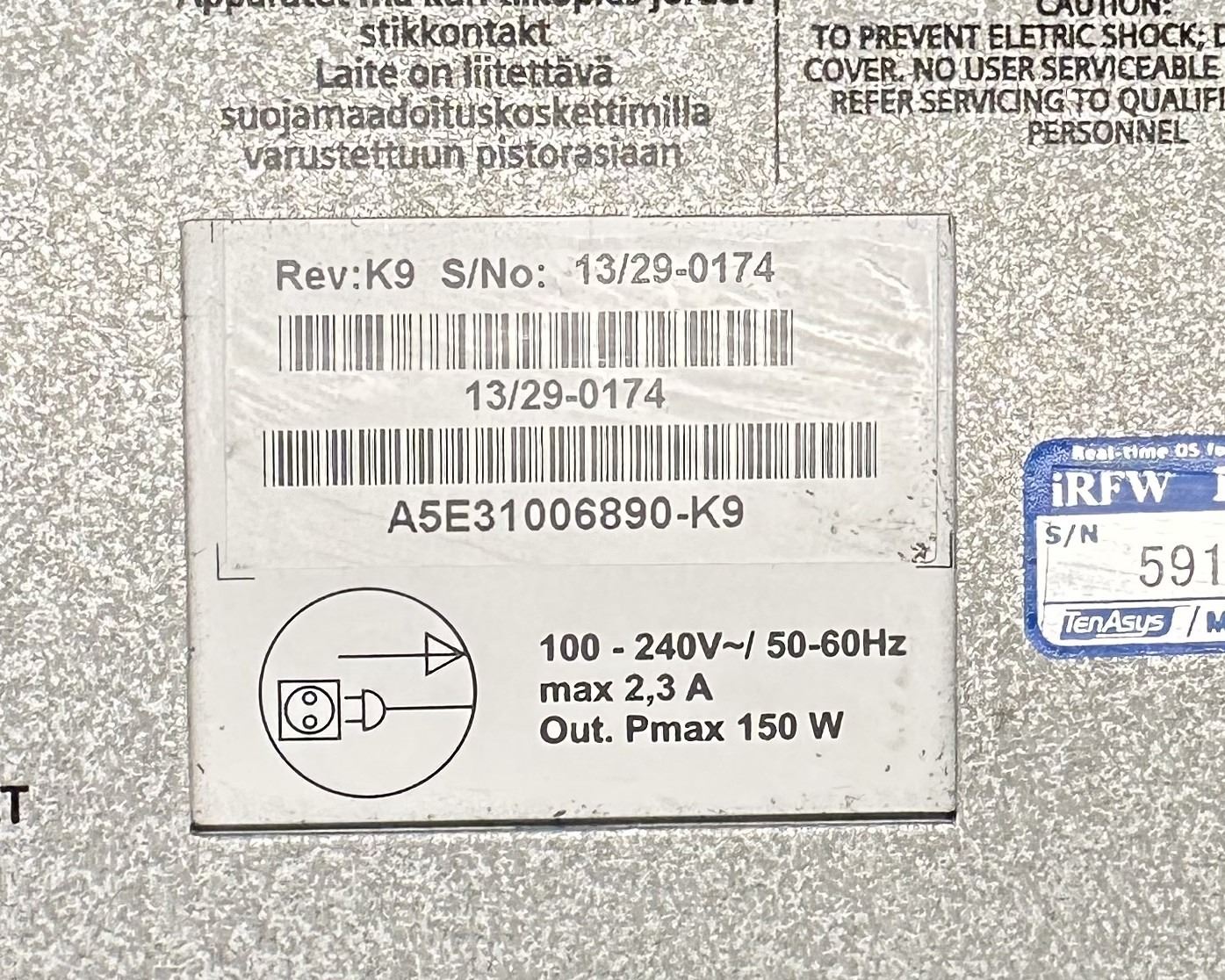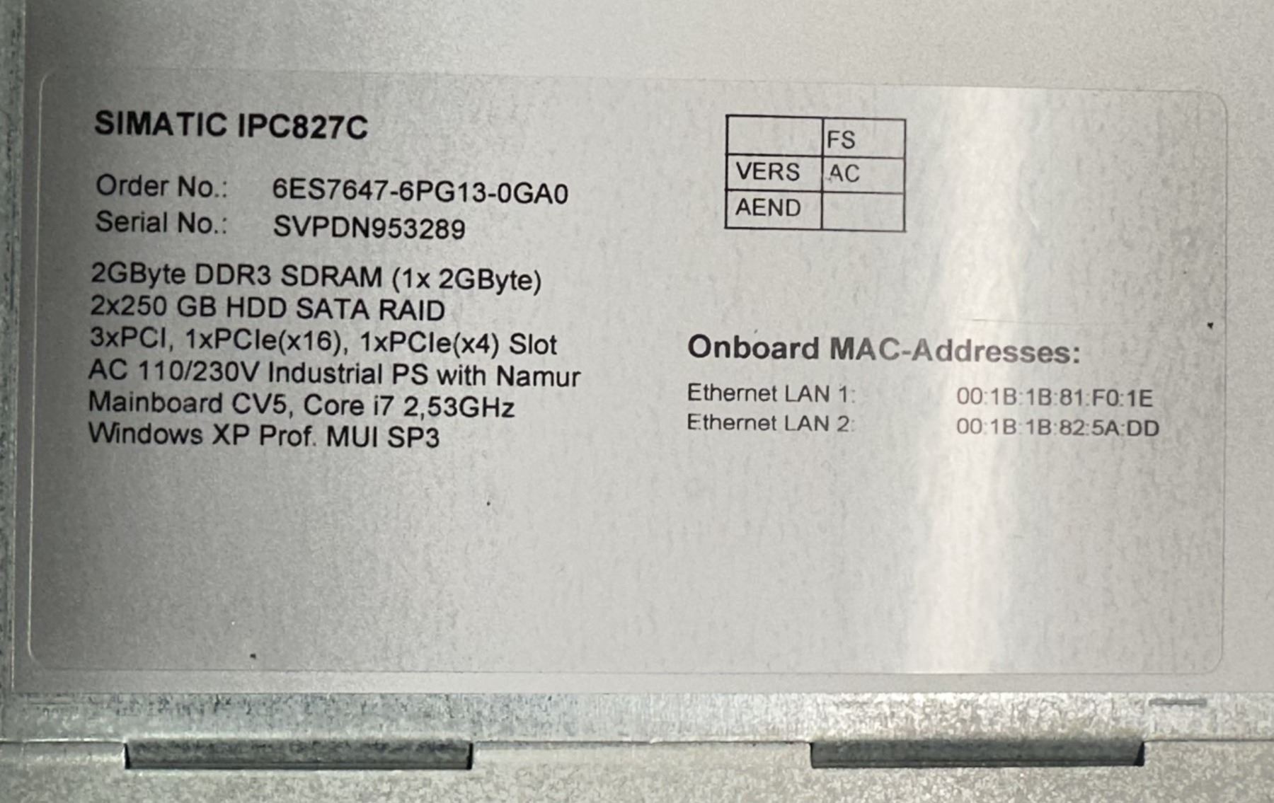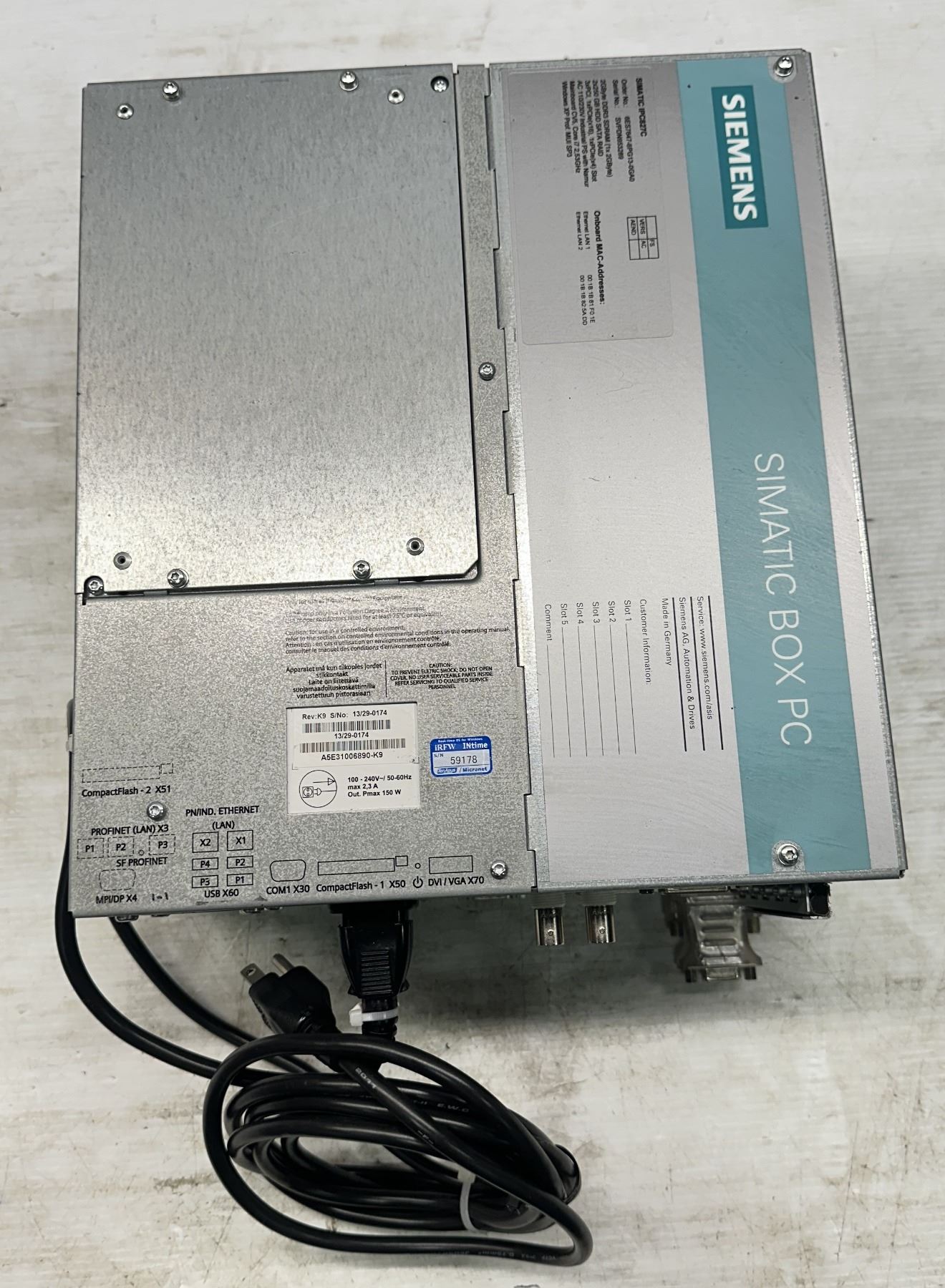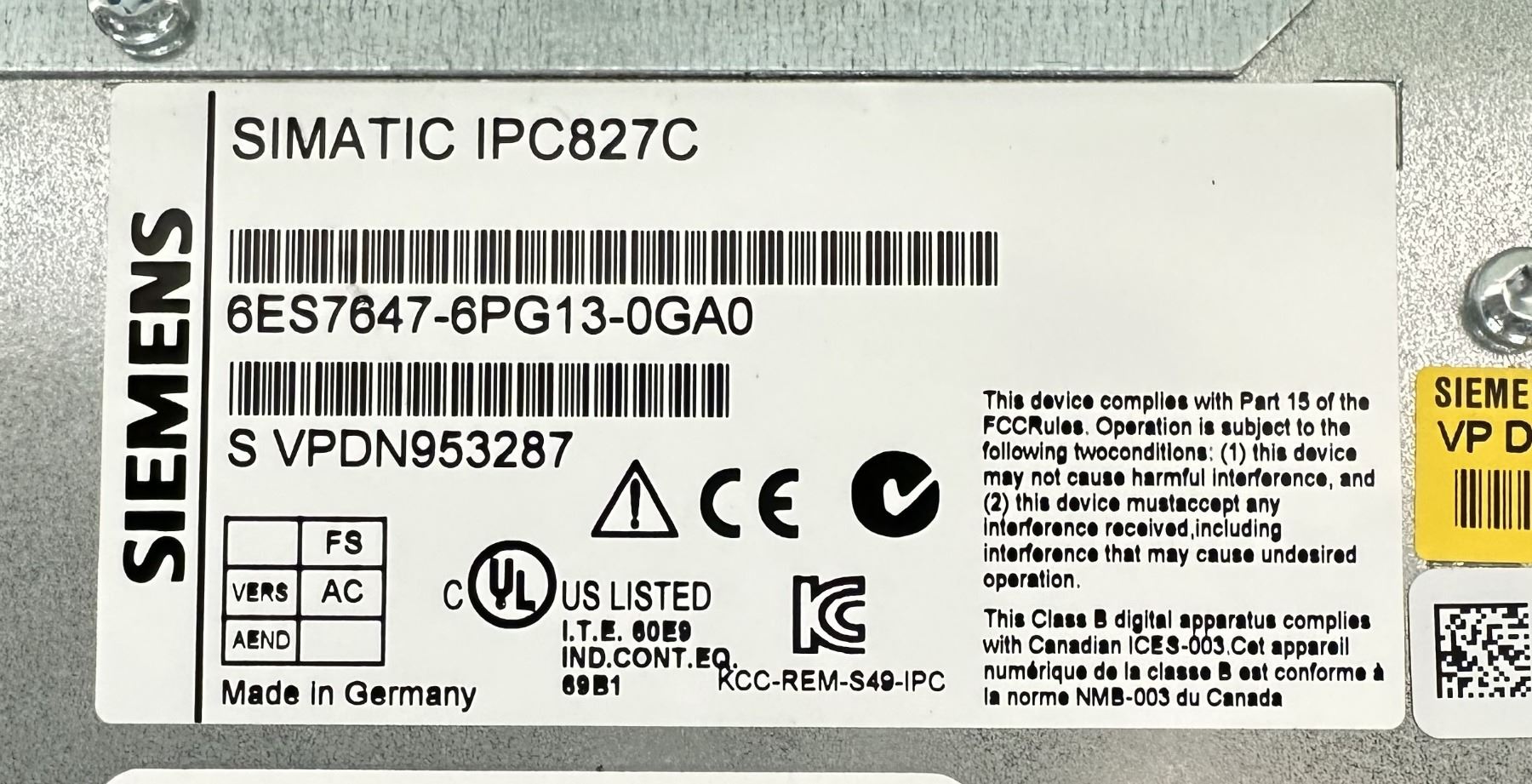 Siemens #6ES7647-6PG13-0GA0 Simatic IPC827C /#A5E31006890-K9 w/ Power Cord