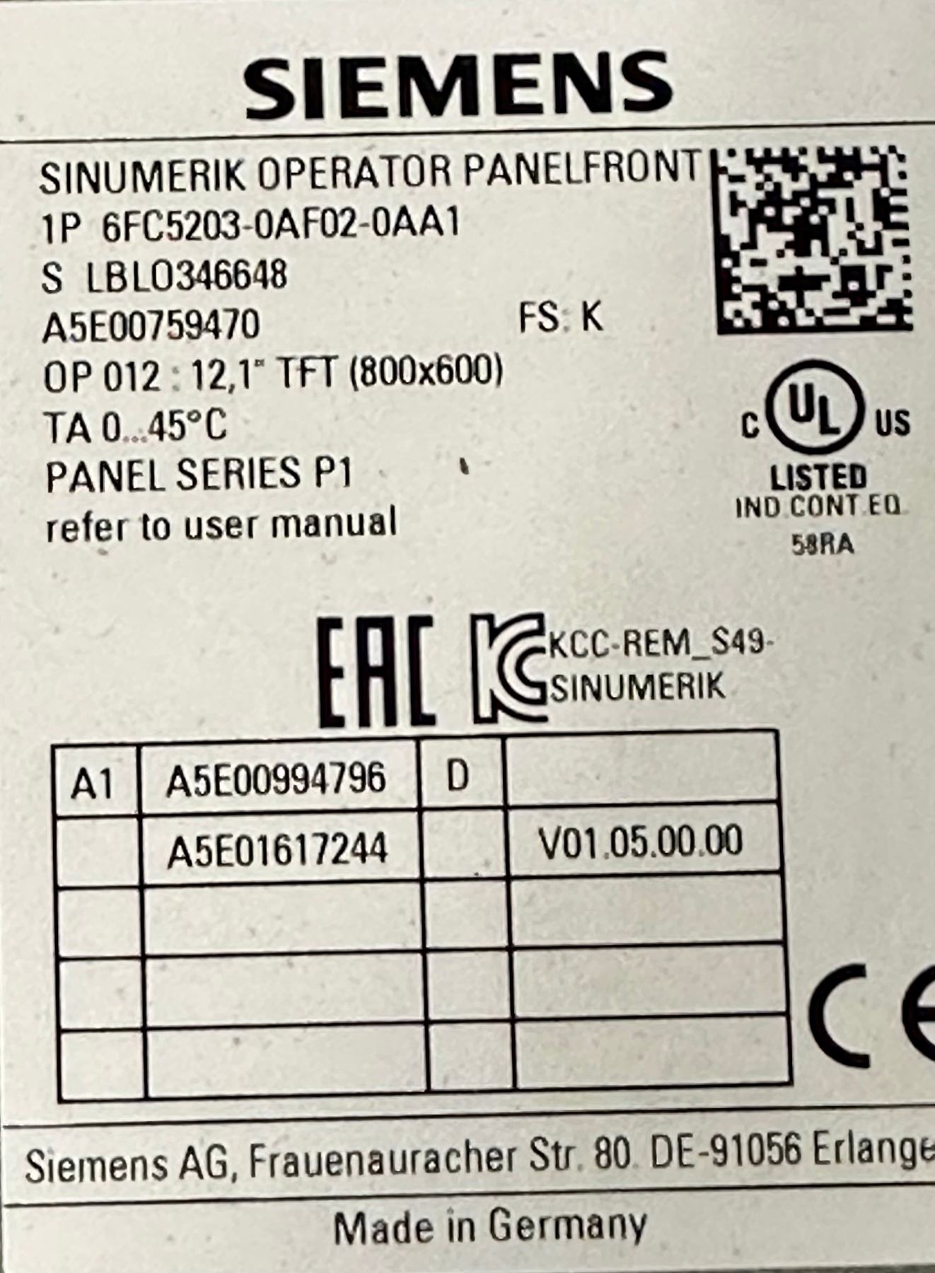 Siemens #6FC5203-0AF02-0AA1 Sinumerik Panelfront