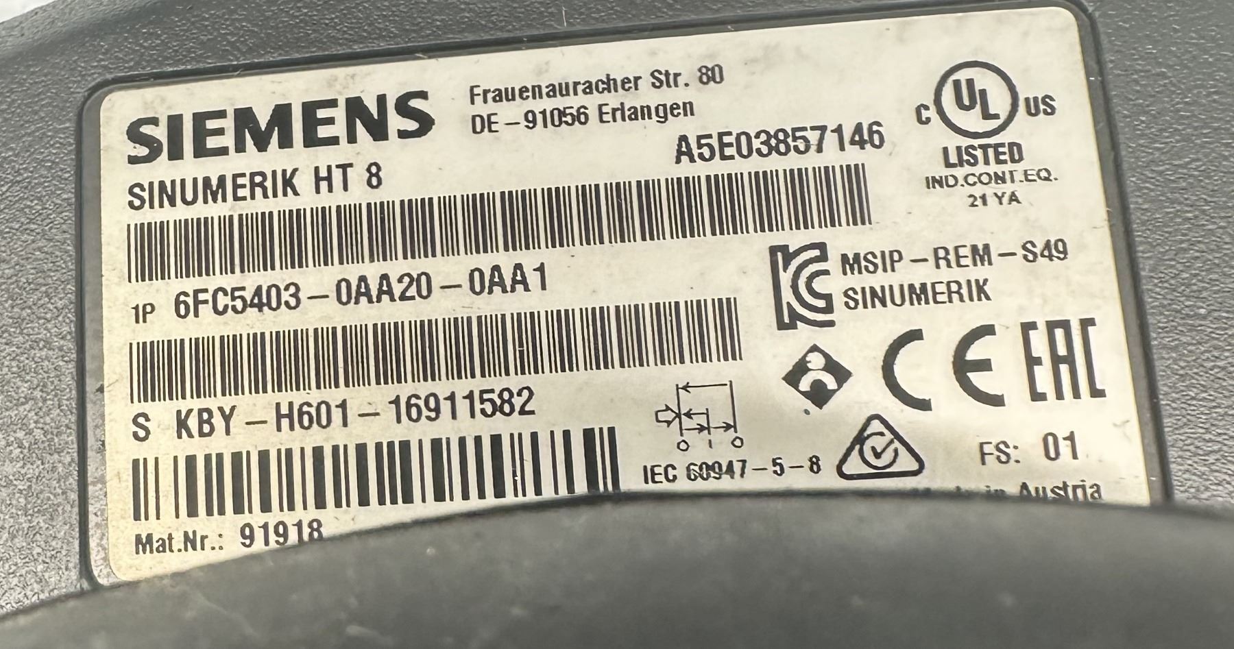 Siemens #6FC5403-0AA20-0AA1 Sinumerik HT 8 Teach Pendent w/ Cable
