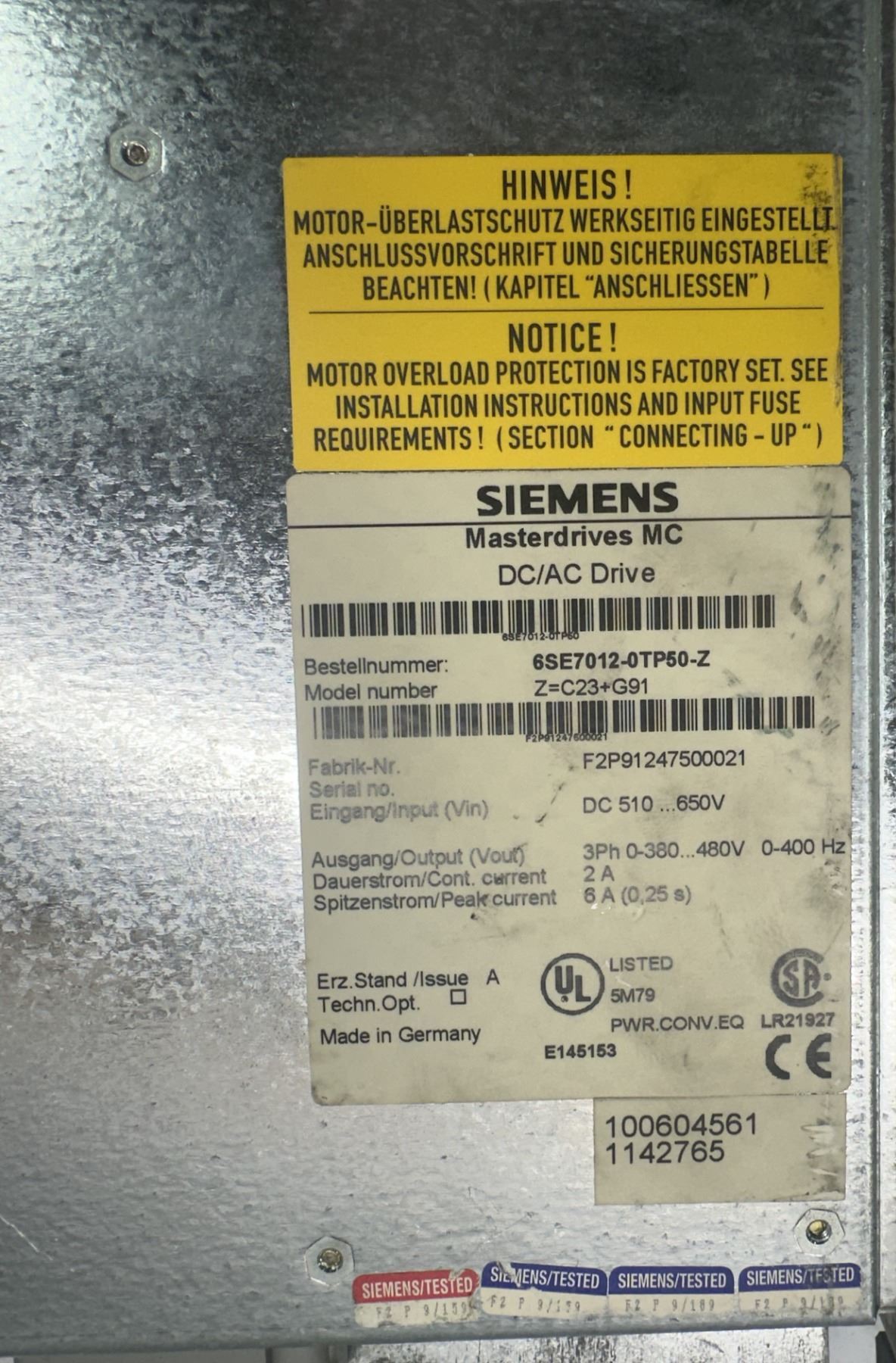 Siemens #6SE7012-0TP50-Z Masterdrives MC DC/AC Drive