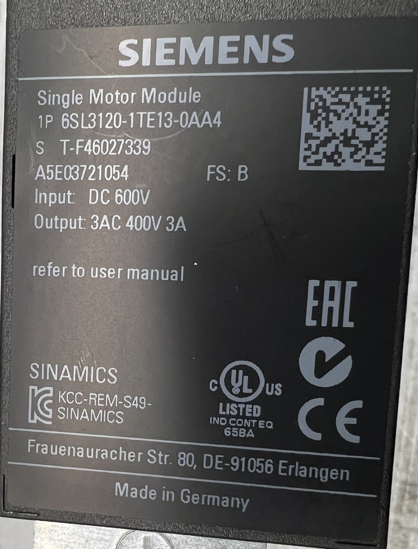Siemens #6SL3120-1TE13-0AA4 Single Motor Module