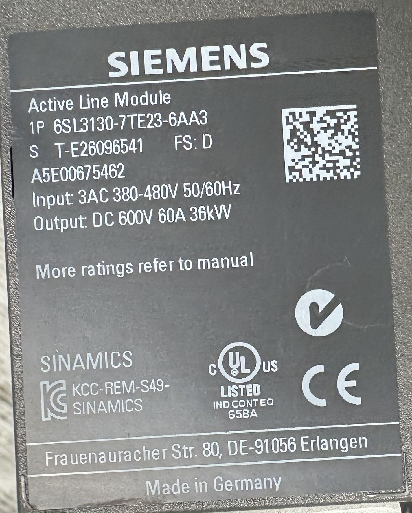 Siemens #6SL3120-7TE23-6AA3 Active Line Module