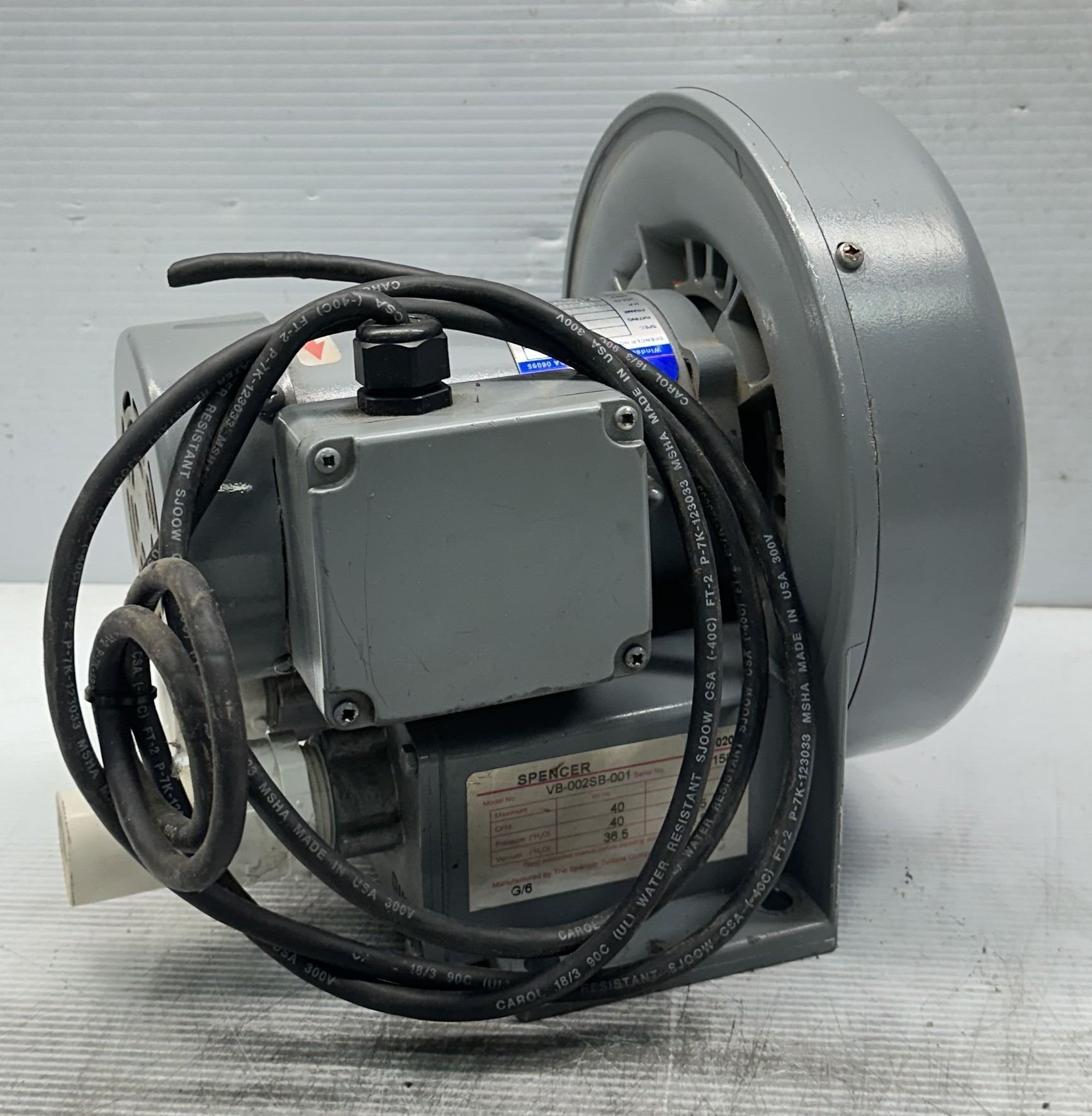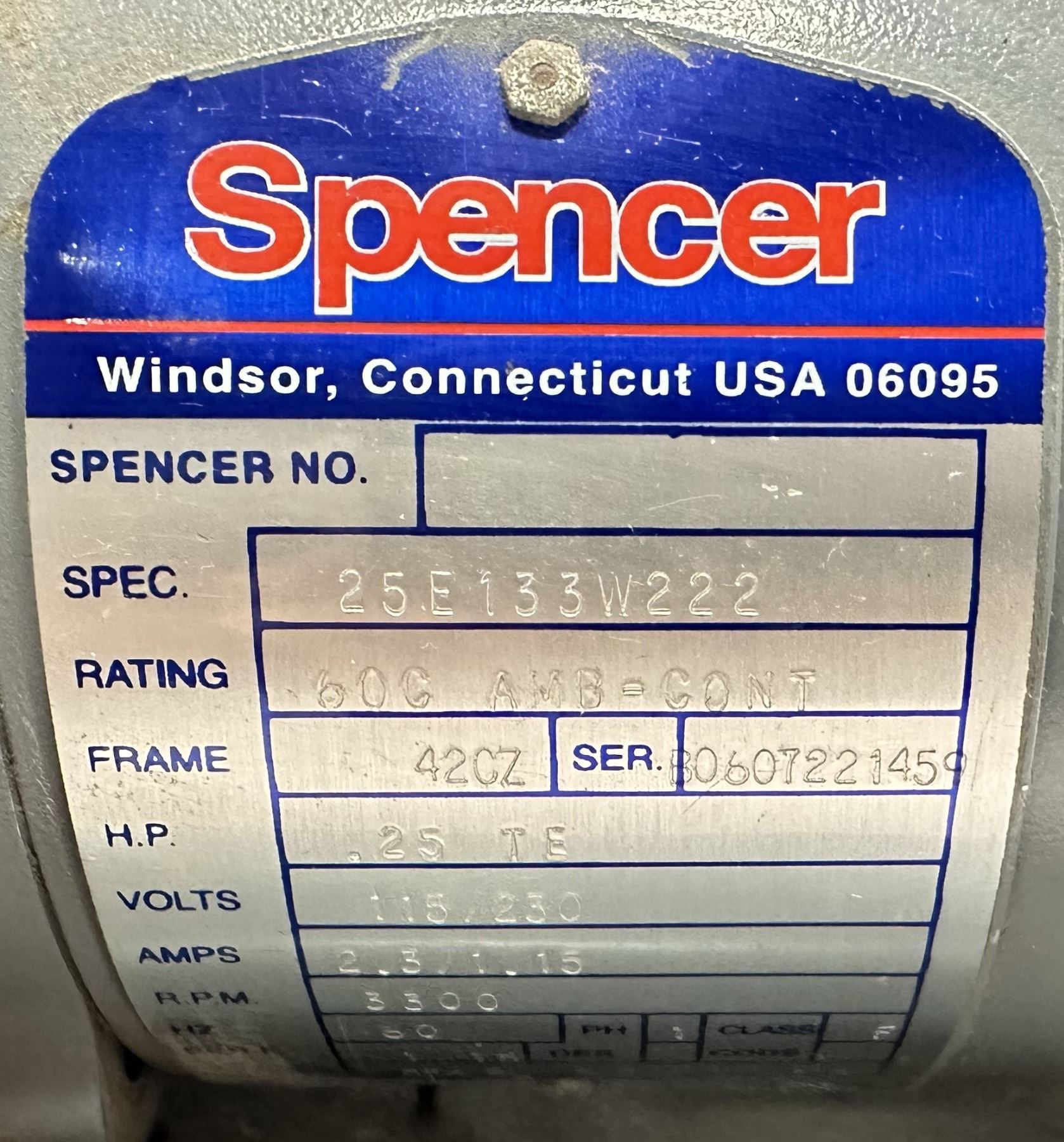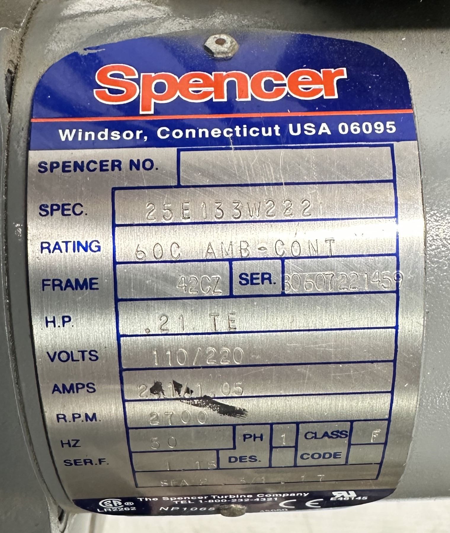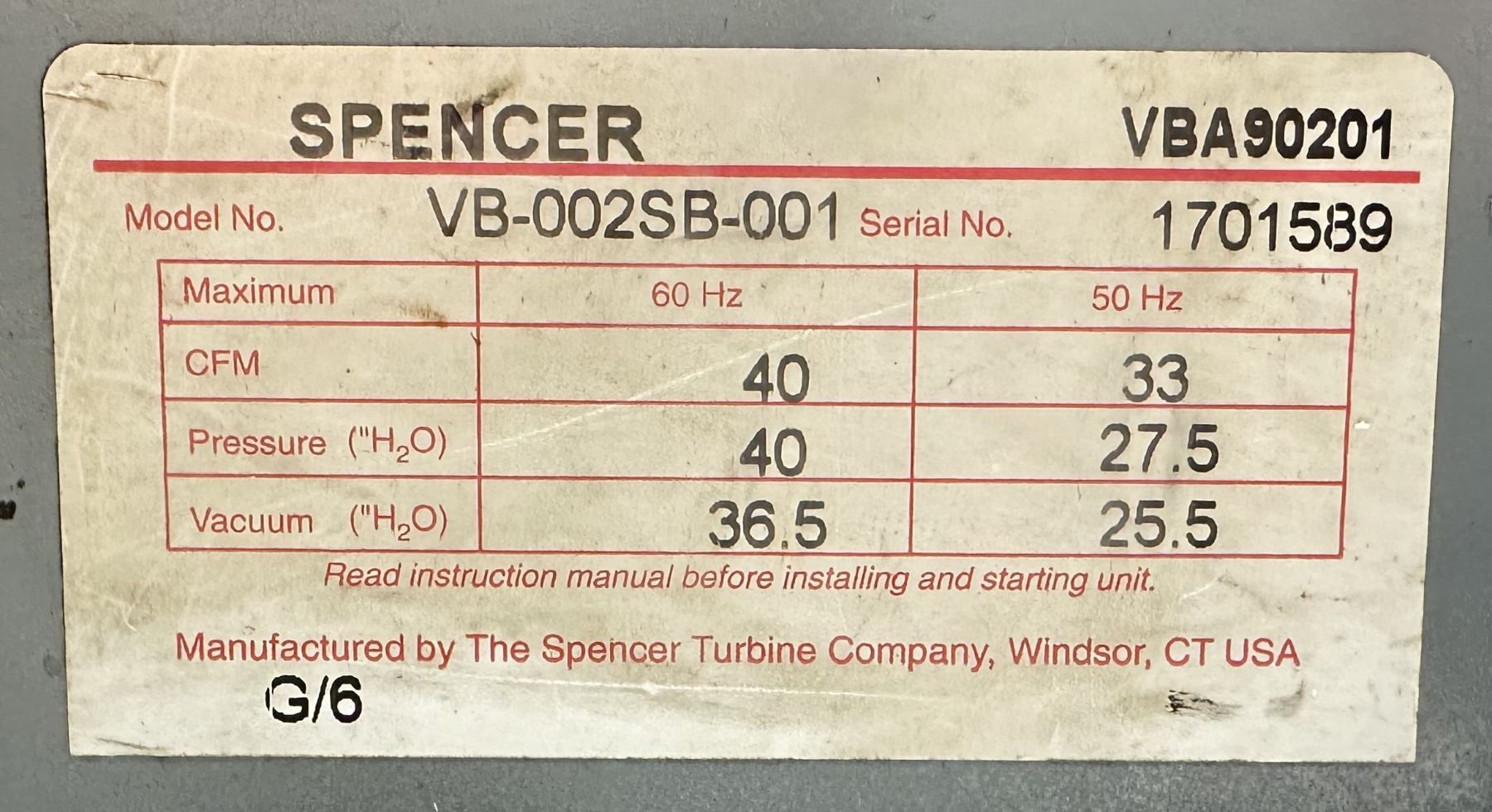 Spencer #VBA90201 / #VB-002SB-001 Vortex Blower Spec. 25E133W222