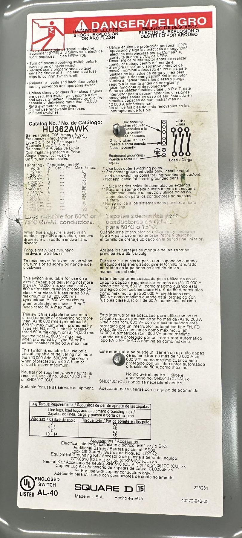 Square D #AL-40 / #HU362AWK Enclosed Switch & Siemens Circuit Breakers
