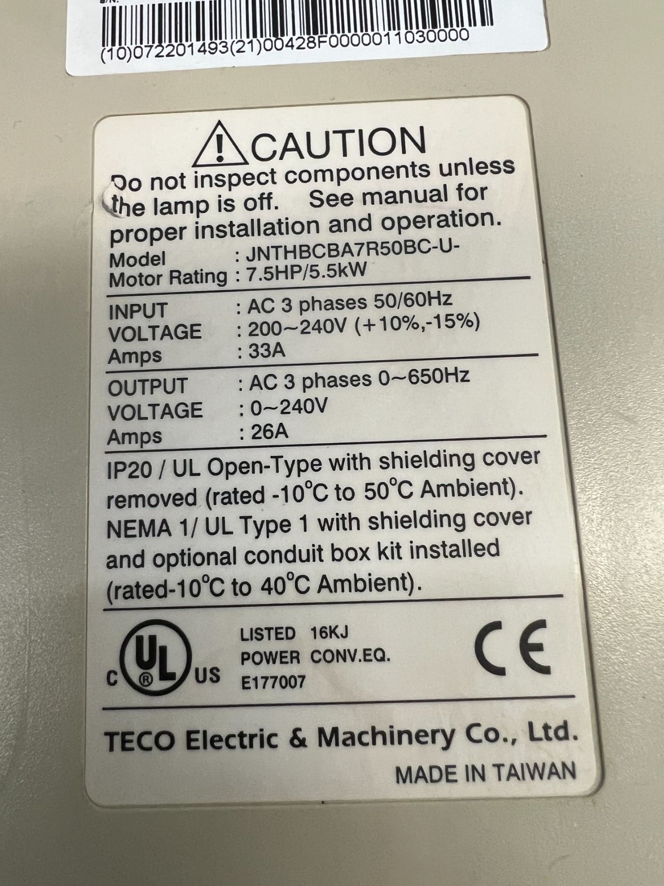TECO Electric #JNTHBCBA7R50BC-U 7.5HP/5.5kW