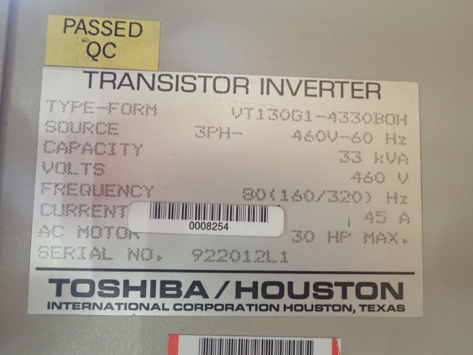 Toshiba/Houston TOSVERT-130G1 Transistor Inverter, M/N: VT130G1-4330BOH