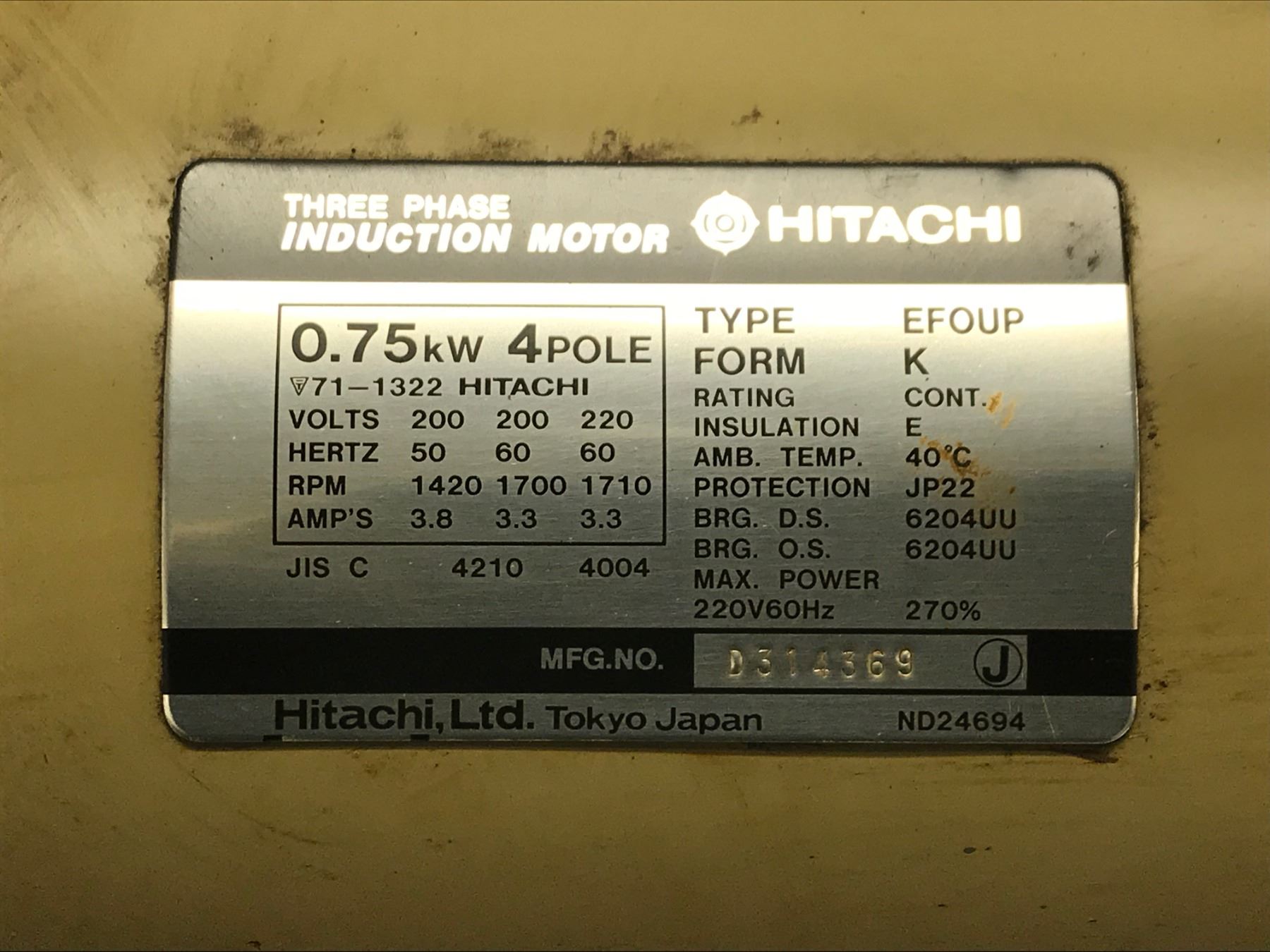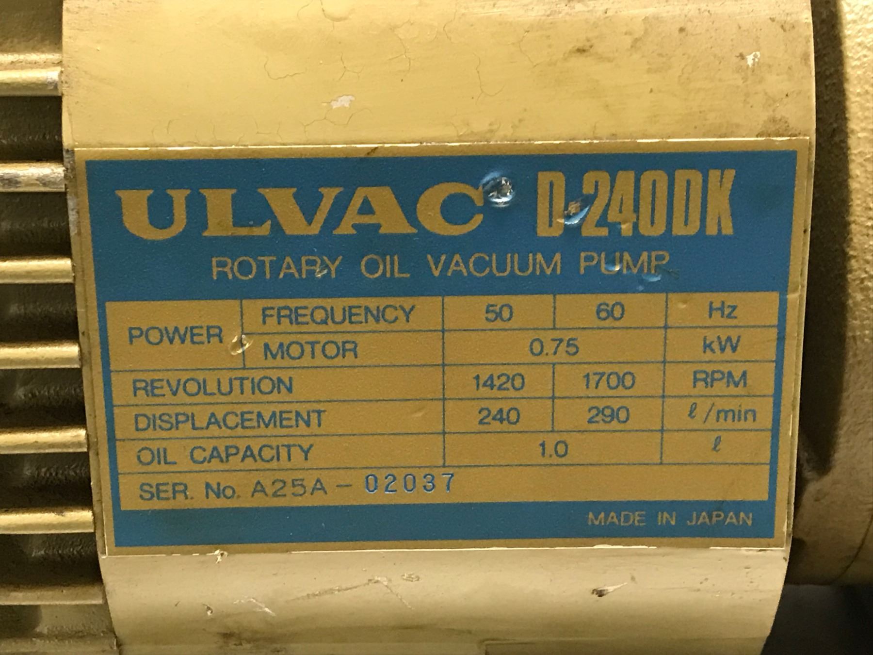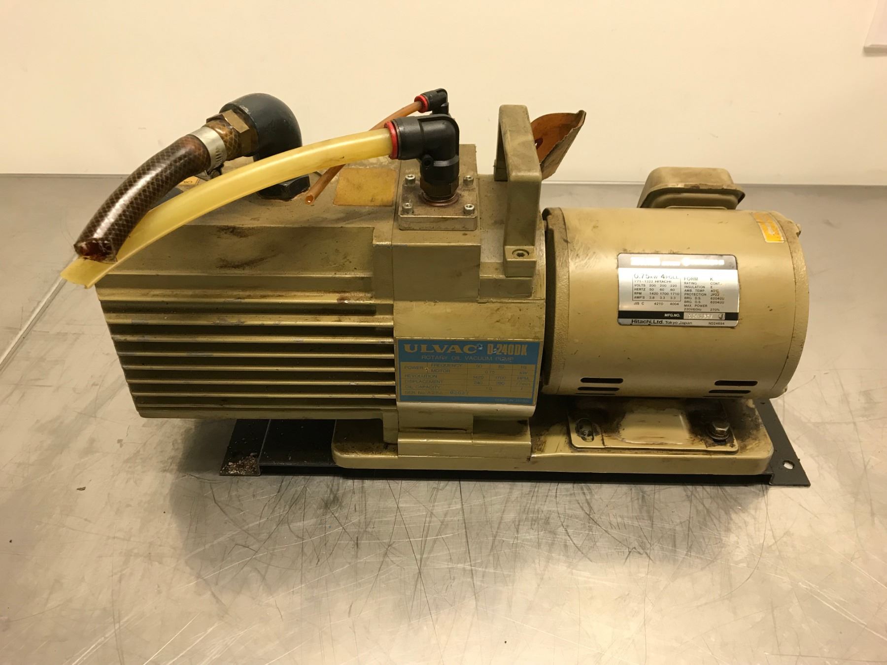 ULVAC D 240DK ROTARY OIL VACUUM PUMP W/ HITACHI EFOUP 3 PAHSE INDUCTION MOTOR