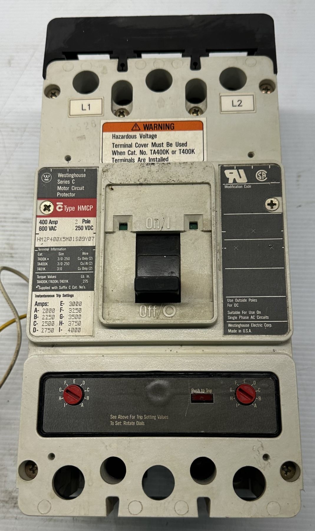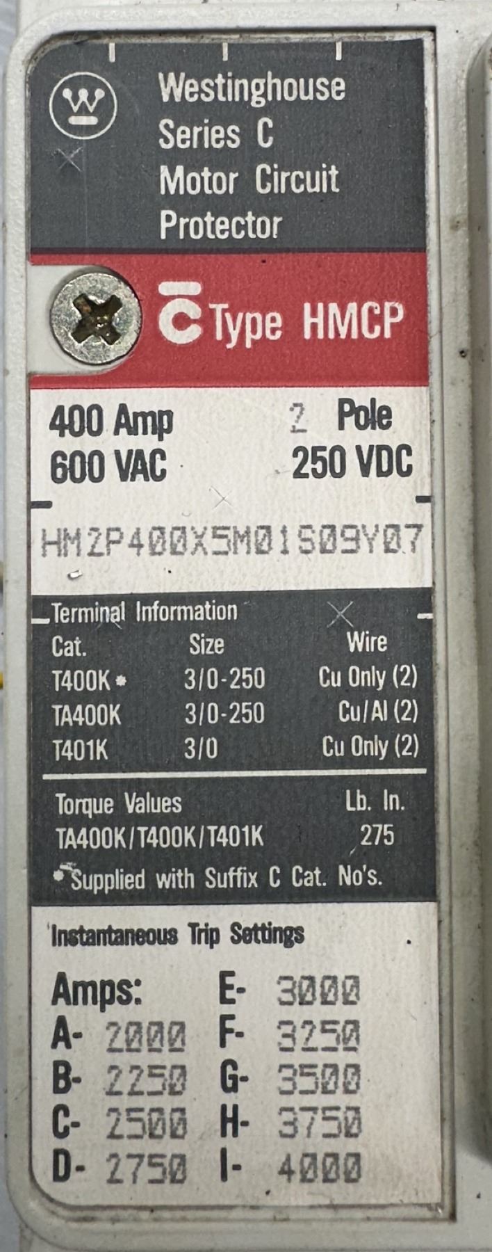 Westinghouse #HM2P400X5M01S09Y07 Circuit Breaker