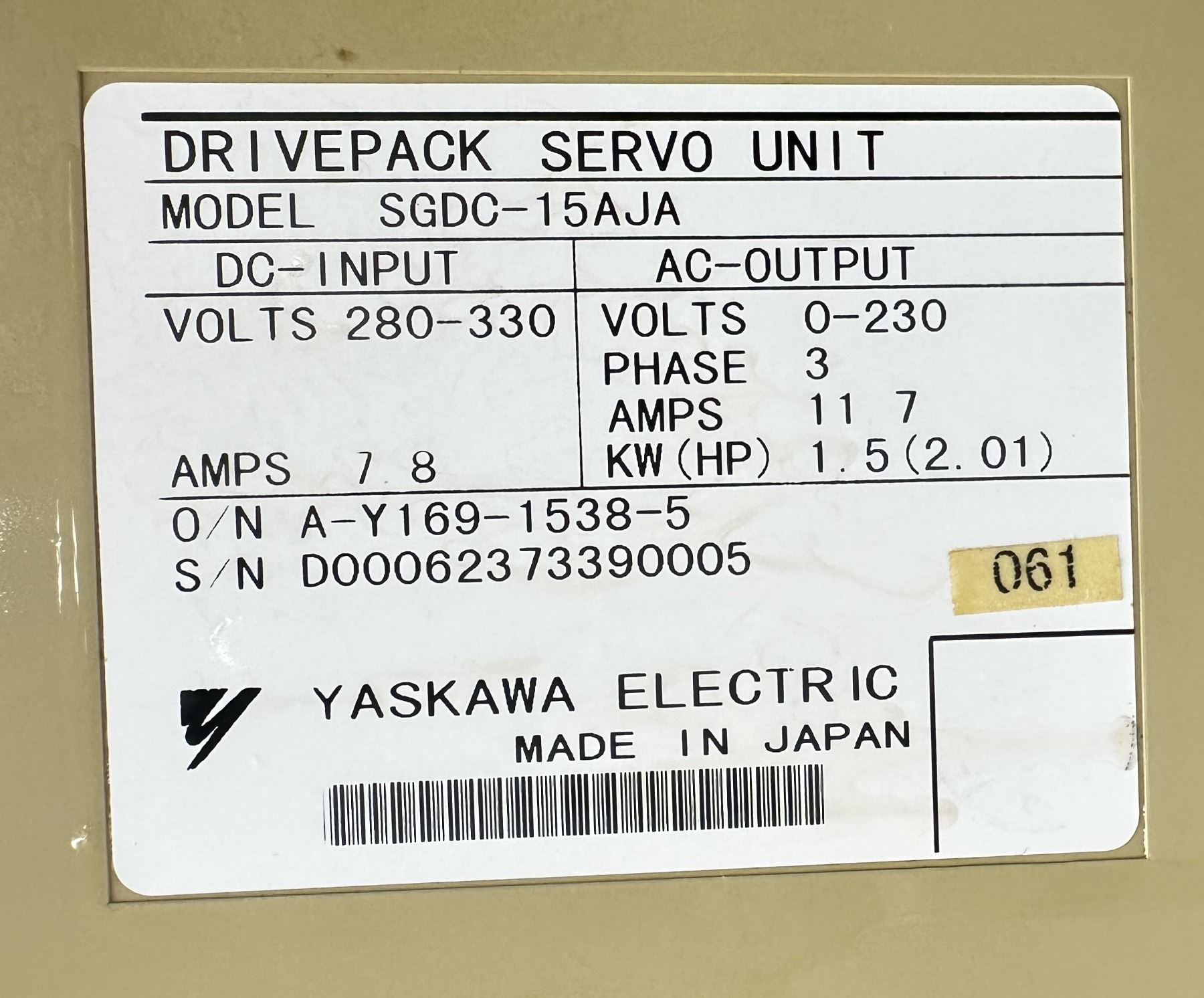 Yaskawa #SGDC-15AJA Drivepack Servo Unit