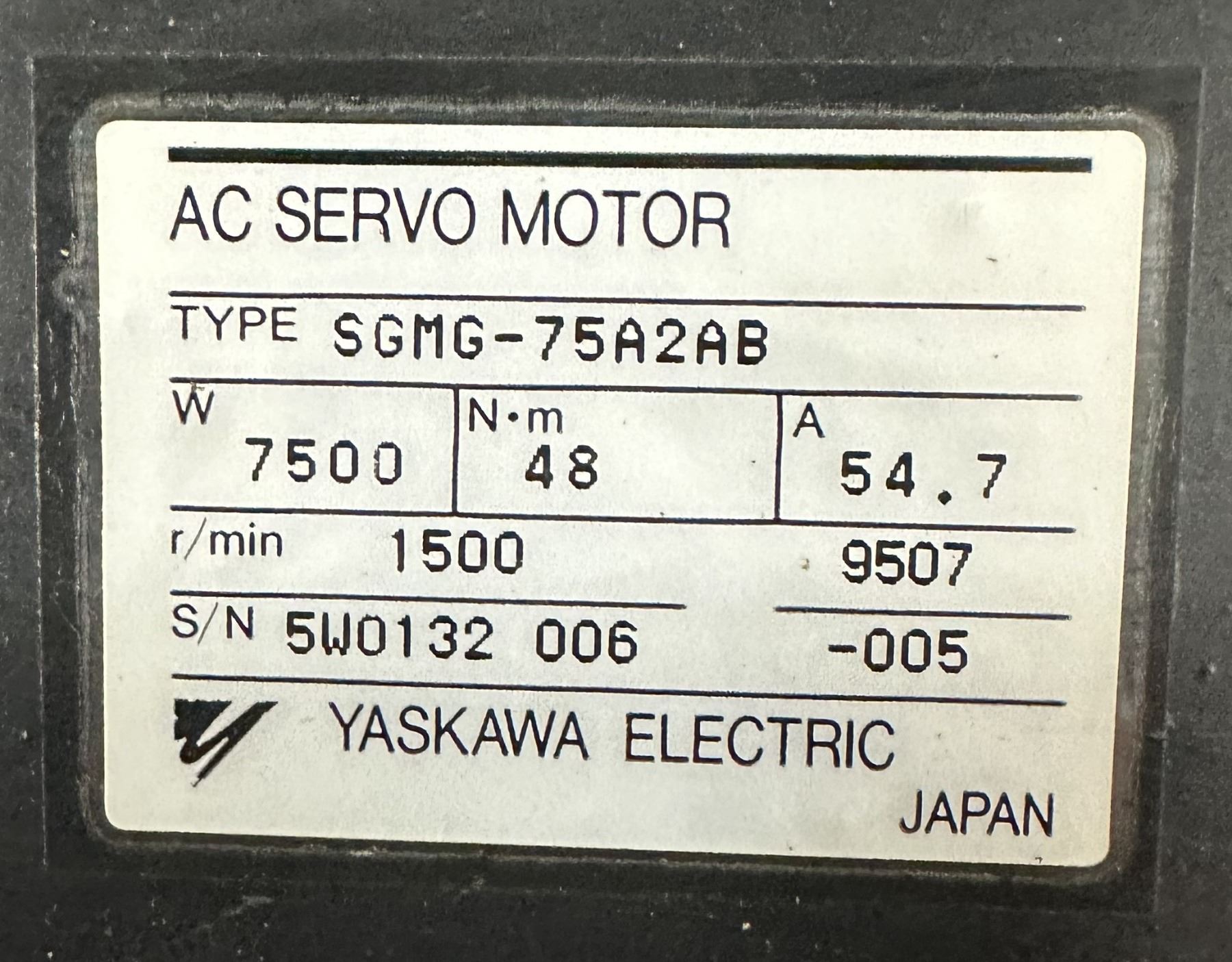 Yaskawa #SGMG-75A2AB AC Servo Motor w/#UTOPH-81AVF Encoder